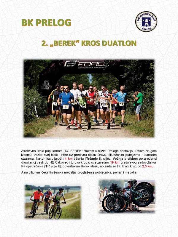 Atraktivnu sportsku utrku priprema za kraj mjeseca lipnja Biciklistički klub Prelog. Atraktivna utrka popularnom ‘XC BEREK’ stazom u blizini Preloga nastavlja u svom drugom izdanju: vozite svoj bicikl, trčite uz predivnu rijeku Dravu, šljunčanim puteljcima i šumskim stazama. Nakon iscrpljujućih 4 km trčanja (Trčanje I), slijedi vožnja biciklom po uređenoj šljunčanoj cesti do HE Čakovec i to dva kruga, sve zajedno 19 km prašnjavog zadovoljstva. Pa opet trčanje (Trčanje II); povratak na Berek stazu, no sada se trči kraći krug od 2,3 km. A na cilju sve natjecatelje čeka finišerska medalja, proglašenje pobjednika, pehari i medalje. Datum održavanja je nedjelja 27. lipnja u 10:00 sati, Berek staza kod Preloga, između starog toka rijeke Drave i derivacijskog kanala HE Čakovec.