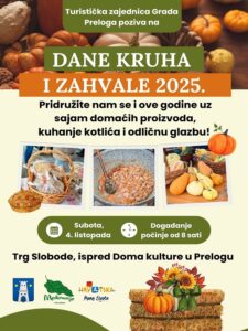 Jesenski dani u našem kraju dani su kada djeca i odrasli na razne načine zahvaljuju na plodovima zemlje i ljudskome radu, donosi se kruh, peciva, voće, povrće i drugi plodovi jeseni, naglašava se važnost zajedništva, zahvalnosti i dijeljenja s drugima. Sve se to u Prelogu tradicionalno obilježava u organizaciji Turističke zajednice Grada Preloga druženjem udruga, vrtića i škola, poljoprivrednih proizvođača, na prigodnoj manifestaciji pod nazivom „Dani kruha i zahvale“. Ove će se godine ova manifestacija održati u subotu, 4. listopada, u sklopu ovogodišnjeg Tjedna župnog Caritasa.  Dani kruha i zahvale, održat će se na Trgu Slobode, ispred Doma kulture u Prelogu, a početak eje od 8 sati ujutro. Uz tradicionalan poziv izlagačima, udrugama, školama, poljoprivrednim proizvođačima i ove se godine pozivaju i udruge s područja Preloga koje žele sudjelovati u pripremi bograča, graha, ribe ili kakvog drugog jela u kotliću da se također prijave. Naravno, ni ove godine neće nedostajati ni dobre glazbe koja će pratiti „Dane kruha i zahvale“.