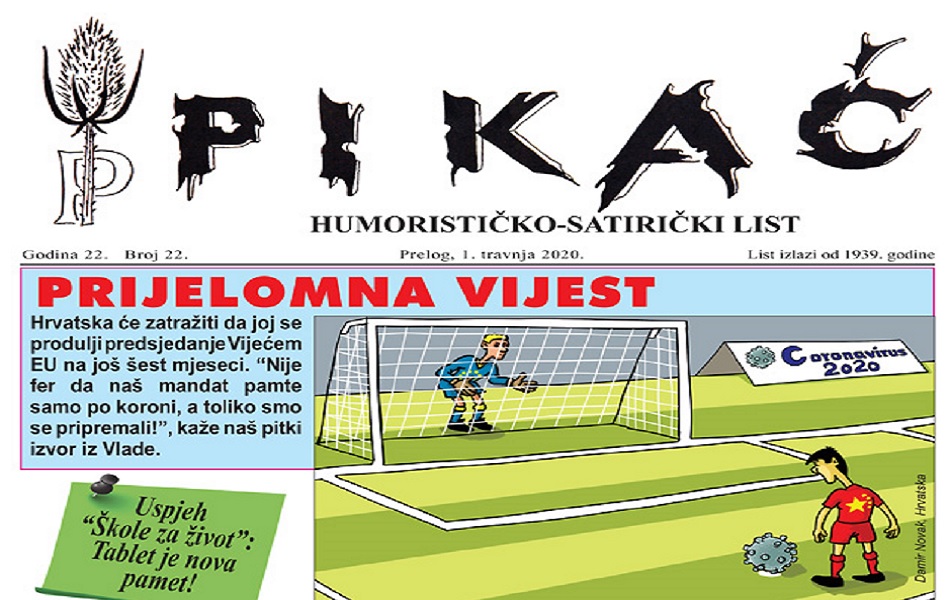 „Hrvatska će zatražiti da joj se produlji predsjedanje Vijećem EU na još šest mjeseci. „Nije fer da naš mandat pamte samo po koroni, a toliko smo se pripremali!“, kaže naš pitki izvor iz Vlade“, kaže tako prijelomna vijest u novom broju Humorističko – satiričkog lista Pikač. Kao što piše u Pikaču, „glavnati i neodgovorni neurednik“ je Ivica Beti, (poli)grafički urednici Maja Kralja i Stjepan Naranđa, a za (re)dizajn je zaslužan Studio Vipro. (Iz)davač je Grad Prelog, a nažalost zbog aktualne situacije (odlično obrađene u Pikaču), promocije neće biti. A i pokazalo se prošlih godina da se na takvim promocijama previše pojelo i popilo te je i to još jedna mjera štednje kojom će se Grad Prelog sigurno pohvaliti. Ako imate mjesto prebivališta na području Grada Preloga, Pikač možete potražiti u utorak, 31. travnja, na nekoj od lokacija koje i dalje rade (dućani, kiosci, u kafićima Pikača nema). Ako niste iz Preloga i ne možete dobiti propusnicu za Prelog zbog ovog razloga, javite se u Upravu Grada Preloga, recite svoju adresu i Pikač stiže do vas. Kolačima ćete uzvratiti nakon prolaska epidemije korona virusa. Zadovoljan je i gradonačelnik Kolarek: „Ajde da se i z mene jemput na leto napravijo norca“, rekao je popularni Ljubo. Nabavite Pikač, jedini list koji će vas u ova vremena nasmijati! I sudjelujte u njihovoj nagradnoj igri: „Darujemo POS-ov stan!“. Naravno, kuponi za nagradnu igru samo u Pikaču. Svaka sličnost sa stvarnim događajima i ljudima je (ne)namjerna.
