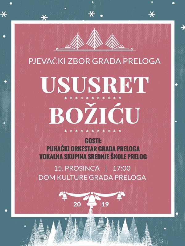 Pjesmu na daske Doma kulture donose članice Pjevačkog zbora Grada Preloga, pod nazivom „Ususret Božiću“. Zajedno sa svojim gostima pripremaju božićni koncert u programu Adventa 2019. godine u Prelogu.  Koncert će se održati u nedjelju, 15. prosinca 2019. godine u 17,00 sati. Njihovi gosti biti će članovi Puhačkog orkestra Grada Preloga te Vokalna skupina Srednje škole Prelog.