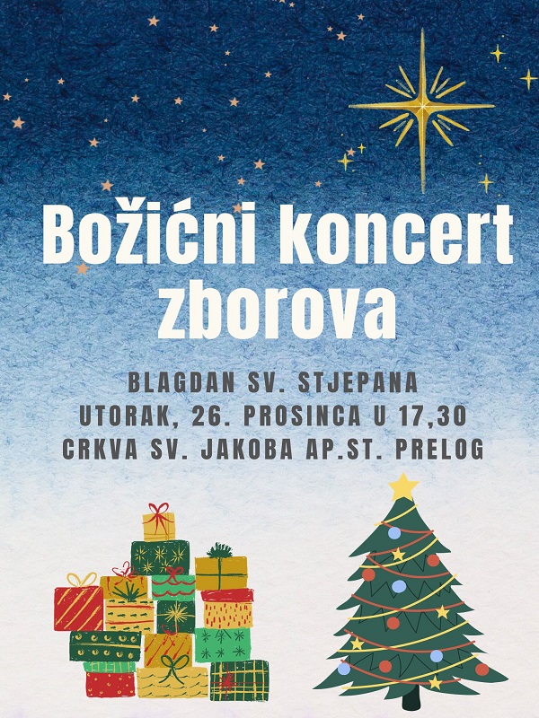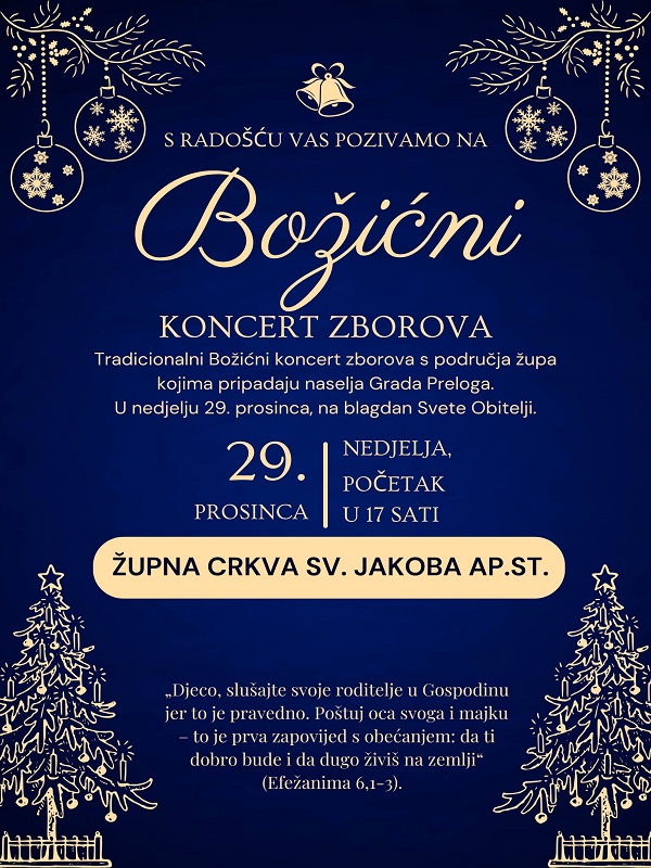 U prekrasnom ambijentu župne crkve u Prelogu, zborovi s područja Grada Preloga predstavit će se onime što najbolje znaju, pjesmom. Biti će tu župni, svjetovni i školski zborovi iz Preloga, Cirkovljana, Draškovca i Svetog Jurja u Trnju. Svatko će svojim glazbenim prilogom uljepšati završetak Božićnih dana i posljednje sate Nove godine. Prošle godine tako su se na jednom mjestu našli Mješoviti pjevački zbor Župe sv. Jakoba ap.st., Tamburaški orkestar te Pjevački zbor mlađeg uzrasta i Pjevački zbor starijeg uzrasta Osnovne škole Prelog, Pjevački zbor Udruge umirovljenika Prelog uz Tamburaški sastav Udruge umirovljenika Prelog, Dječji pjevački zbor „Ribari sv. Jakoba“, Župni zbor Sv. Juraj u Trnju, Mješoviti pjevački zbor Udruge „Prijatelji svetog Roka“ Draškovec, Zbor sv. Svetog Lovre Cirkovljan, Pjevački zbor Grada Preloga te Vokalno instrumentalni sastav Agnus.