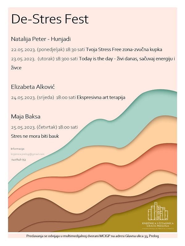 Pozivamo vas na jedinstveno događanje koje će vam pružiti priliku da se oslobodite stresa i naučite važnost relaksacije za vaše zdravlje. Knjižnica i čitaonica Grada Preloga s ponosom predstavlja De-Stres Fest – poseban događaj posvećen promicanju opuštanja. Današnji moderni način života često nas suočava s mnogim izazovima i stresnim situacijama koje mogu negativno utjecati na naše fizičko i mentalno zdravlje. Stoga je iznimno važno naučiti kako se nositi sa stresom i pronaći načine za regeneraciju uma i tijela. Na De-Stres Festu ćemo istražiti različite aspekte stresa i pružiti vam alate i tehnike koje možete primijeniti u svakodnevnom životu kako biste postigli ravnotežu i mir. Sudionici će imati priliku sudjelovati u različitim opuštajućim aktivnostima, poput meditacije, vježbi disanja ili umjetničkih radionica, koje mogu pomoći u opuštanju i oslobađanju napetosti.