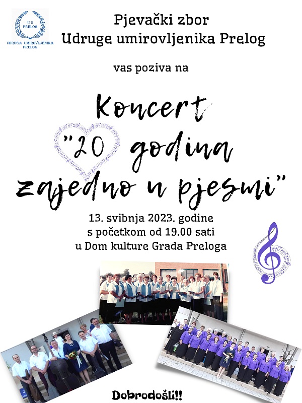 Već dvadeset godina, u sklopu Udruge umirovljenika Prelog djeluje Pjevački zbor Udruge umirovljenika. Svoj će dvadeseti rođendan proslaviti prigodnim koncertom, koji će se održati u subotu, 13. svibnja, s početkom u 19 sati, u Domu kulture Grada Preloga. Pjevački zbor Udruge umirovljenika Prelog svojim se nastupima uvijek rado odaziva pozivima Grada Preloga i Turističke zajednice Grada Preloga, a nastupili su širom Međimurske županije, proputovali Hrvatskom, Slovenijom i Mađarskom. Bili su i domaćini Smotre pjevačkih zborova umirovljenika s područja cijele Hrvatske. Od prvog dana zbor vodi profesorica Ljubica Crnčec. Uz Pjevački zbor Udruge umirovljenika nastupit će i Tamburaški sastav Udruge umirovljenika Prelog, a gosti na koncertu biti će članovi Pjevačkog zbora Grada Preloga, Tamburaški sastav Osnovne škole Prelog te gosti iz mađarskog grada Nagykanisze.