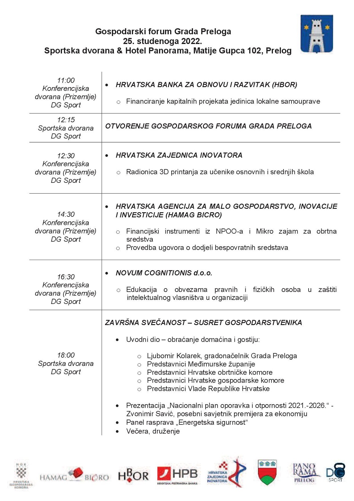Ovogodišnji Gospodarski forum Grada Preloga sastoji se od dva dijela. U prvom dijelu održat će se nekoliko zanimljivih predavanja i radionica, u suradnji Grada Preloga i partnera. U večernjem dijelu održat će se završna svečanost, uz obraćanje uzvanika te tematsku panel diskusiju. Nakon završne svečanosti slijedi i tradicionalno druženje svih poduzetnika s područja Grada Preloga.
