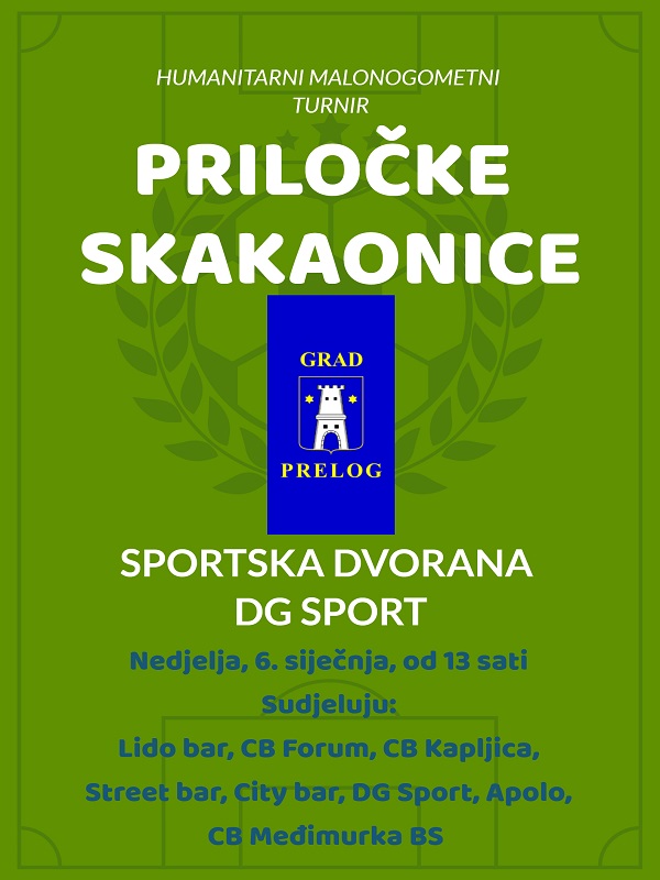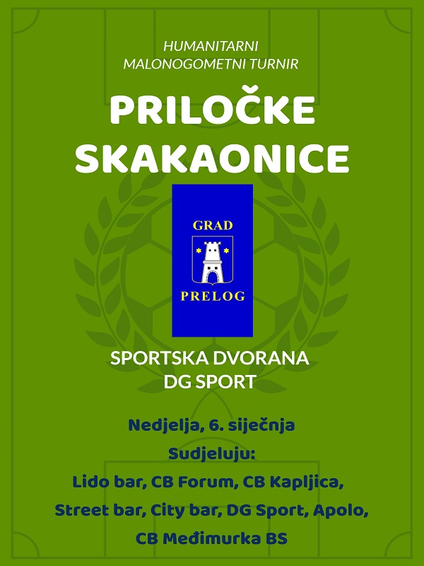 U nedjelju, 6. siječnja, Grad Prelog organizira humanitarni malonogometni turnir, pod nazivom „Priločke skakaonice“. Turnir se organizira po uzoru na slične turnire u većim gradovima te će se na njemu ogledati ekipe kafića, ugostiteljskih objekata s područja Grada Preloga. Pravo nastupa imaju svi stanovnici Preloga, bili oni registrirani ili neregistrirani igrači te oni igrači koji su registrirani u klubovima Grada Preloga. Ukupno se prijavilo osam ekipa koji će se boriti za naslov pobjednika prvog izdanja turnira. U skupini A igrat će: Apolo, Lido bar, City bar, DG Sport, a u skupini B Caffe bar Kapljica, Street bar, Caffe bar Međimurka BS i Caffe bar Forum. Nakon razigravanja po skupinama, igrat će se polufinalne i finalne utakmice. Početak je u 13 sati, a finale je predviđeno za 19,20 sati. Sve će utakmice suditi ponajbolji međimurski suci, braća Igor i Borut Križarić. Dođite u nedjelju poslijepodne u dvoranu DG Sporta i pogledajte najbolje što nudi nogometni Prelog. Svaka od ekipa plaćanjem kotizacije uključit će se u humanitarnu akciju, a svaki posjetitelj moći će dati svoj dobrovoljni prilog.