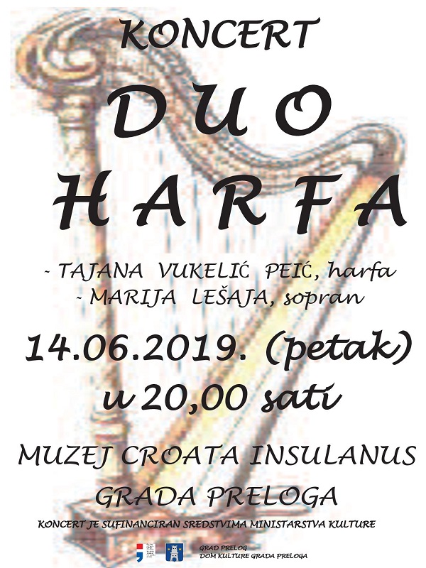 U petak, 14. lipnja 2019. godine, u Muzeju Croata insulanus Grada Preloga održati će se koncert Tajane Vukelić Peić (harfa) i Marije Lešaja (sopran). Ulaz je slobodan, a koncert je sufinanciran sredstvima Ministarstva kulture Republike Hrvatske. Početak koncerta je u 20,00 sati.