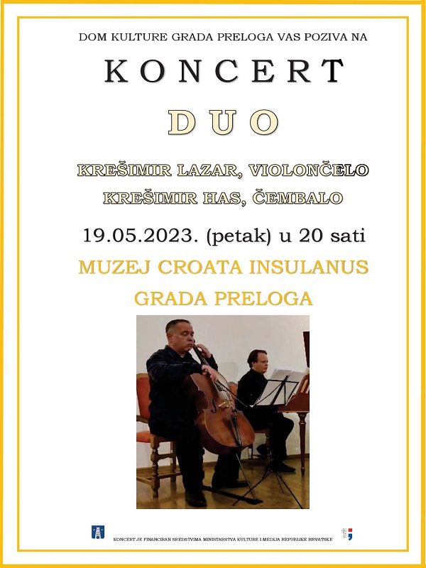 Dom kulture Grada Preloga organizira u petak, 19.05.2023. godine, drugi koncert, koji je odobren od Ministarstva kulture i medija Republike Hrvatske u sklopu Programa javnih potreba u kulturi. U prostoru Muzeja Croata insulanus Grada Preloga nastupiti će duo Krešimir Lazar (violončelo) i Krešimir Has (čembalo). Ulaz je besplatan, a početak je u 20,00 sati. Na repertoaru će se naći djela Michela Correttea te Andrije Motovunjanina.