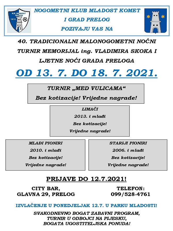 Nogometni klub Mladost Komet iz Preloga organizira, 40. po redu, tradicionalni Malonogometni noćni turnir te usporedo s njim Ljetne noći Grada Preloga. I ove godine priprema se bogat zabavni program, uz koncerte Tomislava Bralića i Klape Intrade (15. srpnja), Duška Lokina (16. srpnja) i Belfast Fooda (17. srpnja).