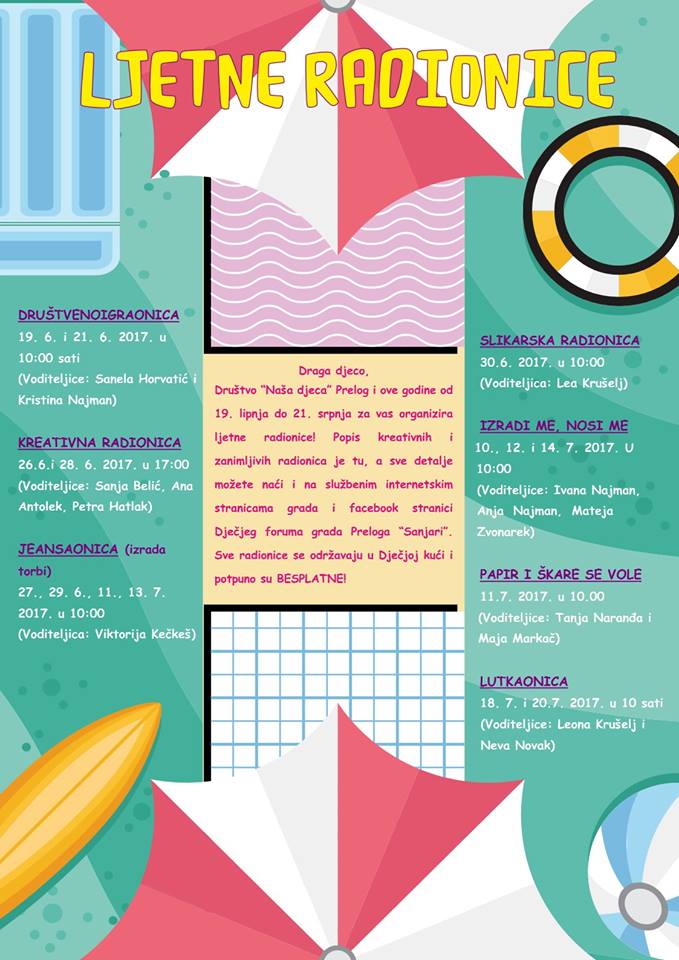 Društvo Naša djeca Prelog i ove godine od 19. lipnja do 21. srpnja za vas organizira ljetne radionice! Popis kreativnih i zanimljivih radionica je tu, a sve detalje možete naći i na službenim internetskim stranicama grada i facebook stranici Dječjeg foruma grada Preloga Sanjari. Sve radionice se održavaju u Dječjoj kući i potpuno su BESPLATNE!