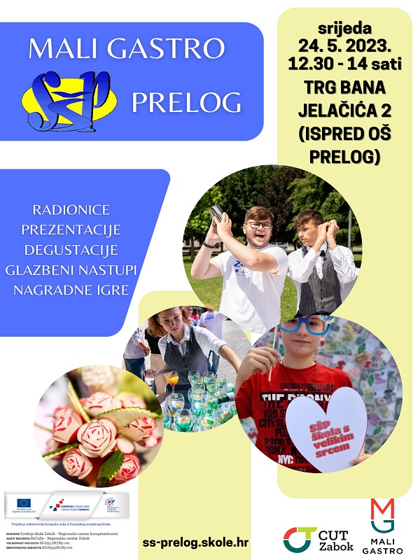 U cilju promocije Srednje škole Prelog te zanimanja koja se upisuju (opća gimnazija, ekonomist, turističko hotelijerski komercijalist, kuhar, konobar, slastičar, pekar, mesar, pomoćni konobar, te pomoćni kuhar slastičar) škola i ove godine organizira promocijsku manifestaciju pod nazivom „Mali Gastro“ u Prelogu. Kako je škola partner na europskom projektu ReCeZa, čiji je nositelj Srednja škola Zabok, u  manifestaciju će biti uključene i ostale škole partneri te predstavnici realnog sektora, a sve sa željom da se djeci /osmašima pokaže što se sve nudi, kako se radi, koje rezultate škola ima te ono najbitnije – da vide što bi upisom ovih zanimanja dobili i u smislu mogućnosti zaposlenja i u pogledu kasnijeg upisa na više i visoke škole. Manifestacija Mali Gastro održat će se u srijedu 24. svibnja na platou ispred Osnovne škole Prelog. Započet će u 12.30, a završiti u 14 sati.