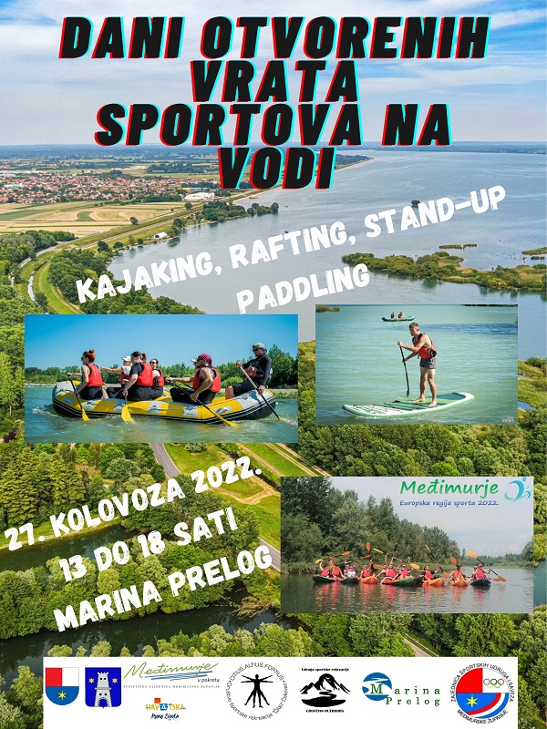 Nakon odgode Dana otvorenih vrata sportova na vodi proteklog vikenda zbog lošeg vremena, popularna manifestacija održat će se u subotu, 27. kolovoza, na Marini Prelog. Uz stručni nadzor i upute instruktora, posjetitelji će se od 13 do 18 sati besplatno moći okušati u vožnji kajakom, čamcem za rafting, kanuom ili pak SUP-om (veslanje na dasci za surfanje). Uz dobro raspoloženje, savjetuje se da posjetitelji donesu i odjeću primjerenu za sportove na vodi te ručnike. Ova hvalevrijedna manifestacija pod pokroviteljstvom Međimurske županije, a u organizaciji Grada Preloga, Turističke zajednice Grada Preloga, Marine Prelog d.o.o. te Zajednice sportskih udruga i saveza Međimurske županije jedinstvena je u Međimurju, a započela je prošle godine u ljetnim mjesecima. Cilj manifestacije jest promovirati zdrav način života, kretanje i sportove na vodi, ali i neiskorištene turističke i rekreativne potencijale na Dravi te time potvrditi titulu Međimurje – Europska regija sporta 2022. Dane otvorenih vrata provodit će članovi Udruge sportske rekreacije Croatian Outdoors Oporovec i Društvo sportske rekreacije ČAKI Čakovec.