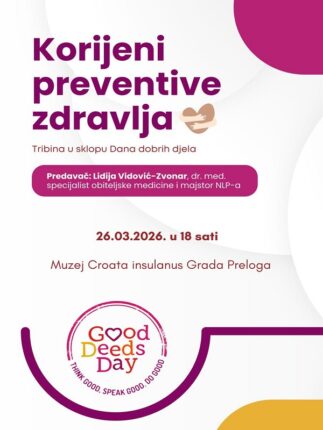 Završeno Od 26.03.26. 00:00 do 26.03.26. 23:00 Predavanje “Korijeni preventive zdravlja” u sklopu Dana dobrih djela Saznajte više