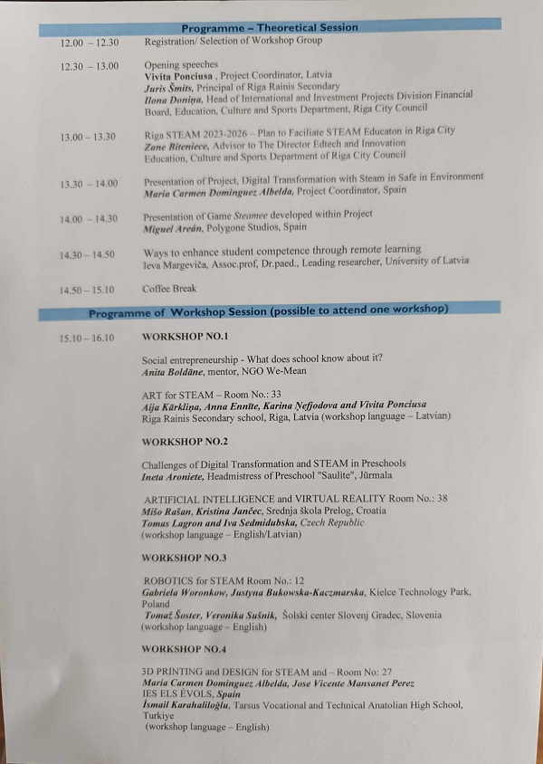 Nastavnici Kristina Jančec i Mišo Rašan četiri dana su proveli u Rigi, glavnom gradu Latvije. Sudjelovali su na međunarodnoj konferenciji „DIGITAL TRANSFORMATION WITH STEAM IN A SAFE ENVIRONMENT“, na kojoj su bili prezentirani ishodi istoimenog projekta u kojem škola sudjeluje. U sklopu projekta nastavnici su održali i radionicu pod nazivom „Umjetna inteligencija i virtualna stvarnost“ zajedno sa češkim partnerima. Bio je to posljednji sastanak partnera iz Latvije, Španjolske, Slovenije, Poljske, Turske i Češke, koji su preko dvije godine zajedno surađivali na izradi novih kurikuluma, video lekcija i video igara kako bi se pospješilo usvajanje novih vještina učenika na području umjetne inteligencije, robotike, 3D printanja i virtualne stvarnosti. Posljednji dan proveli su s kolegama razgledavajući prekrasnu Rigu, posjetili Baltički zaljev te pozdravili hrvatske navijače ususret utakmice Hrvatska i Latvije.