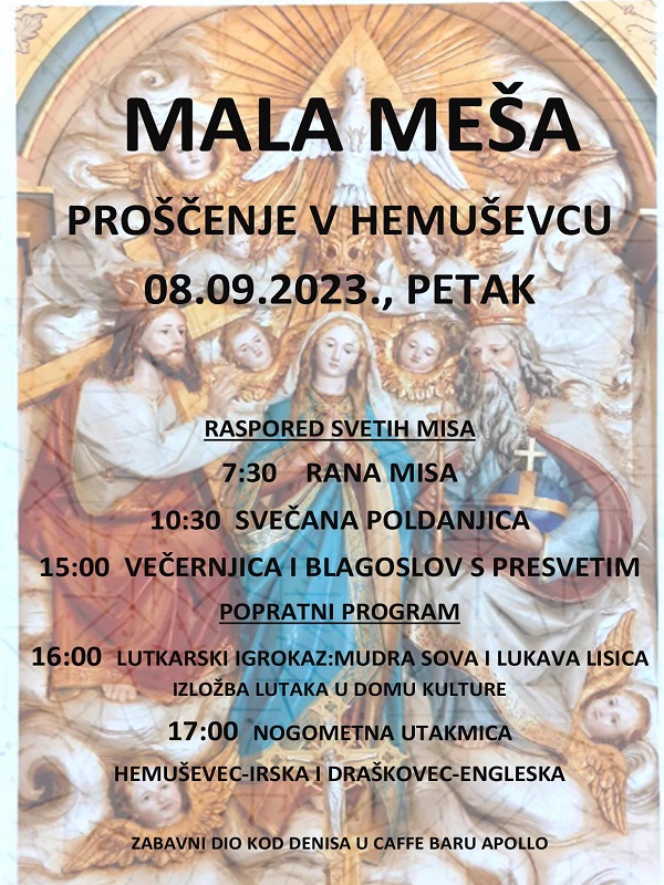 Blagdan Male Gospe, mjesno proštenje, obilježit će se u Hemuševcu, u petak, 8. rujna. Misna će se slavlja održati u 7,30 sati (za bolesne i pokojne sela Hemuševec), 10,30 sati (svečana poldanjica) te u 15,00 sati (večernja misa). U poslijepodnevnim satima, u Domu kulture u Hemuševcu, za najmlađe mještane organizira se i pravo malo iznenađenje – lutkarski igrokaz „Mudra sova i lukava lisica“, u izvođenju Dječje scene Teatra Gavran. Ulaz je slobodan, a početak je predstave u 16 sati. Od 16 sati u Domu kulture posjetite i zanimljivu izložbu lutaka, koje je izradila Smiljana Strahija, pod nazivom “Vunena čarolija”. Od 17 sati na igralištu Nogometnog kluba Draškovec, odigrat će se tradicionalna prijateljska utakmica Hemuševca (Irska) i Draškovca (Engleska). U večernjim satima, prigodno druženje biti će organiziran u centru Hemuševca, kod Caffe bara Apollo.