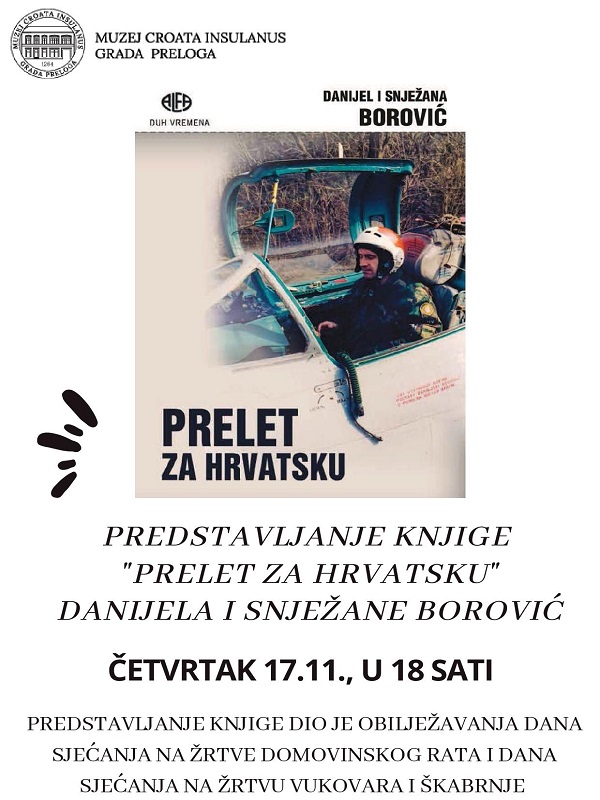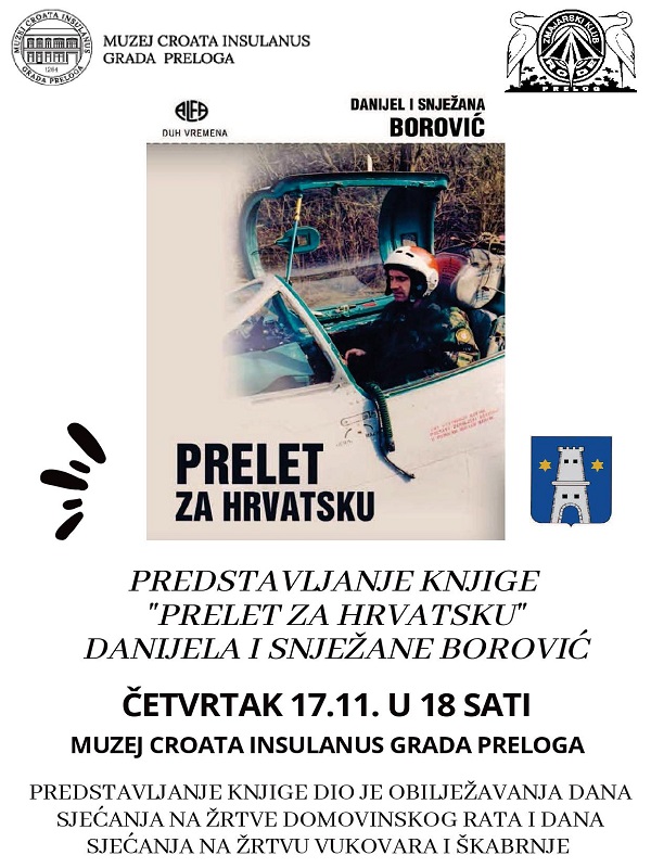 Nakon paljenja svijeća, u prostoru Multimedijalne dvorane Muzeja Croata insulanus Grada Preloga, u četvrtak 17. studenog, s početkom u 18 sati, održat će se predstavljanje knjige „Prelet za Hrvatsku“, autora Danijela i Snježane Borović. 4. veljače 1992. u večernjim satima, unatoč iznimno nepovoljnim uvjetima, pilot kapetan 1. klase Danijel Borović izvršio je prelet avionom lovcem tipa MiG-21 s aerodroma Bihać, sletio u Pulu i stavio se na raspolaganje Hrvatskoj vojsci. Tim je Borovićevim preletom Hrvatska dobila prvi nadzvučni borbeni zrakoplov, čime je označen početak ustroja eskadrile lovaca u Hrvatskome ratnom zrakoplovstvu. Nakon pogibije zapovjednika Rudolfa Perešina, Danijel Borović preuzeo je zapovjedništvo nad borbenom eskadrilom.