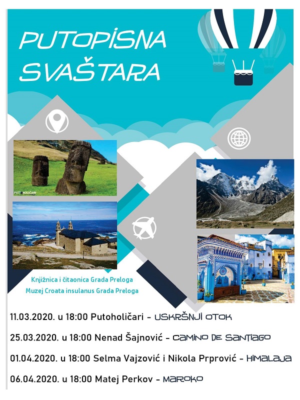 Već četvrtu godinu za redom Knjižnica i čitaonica te Muzej Croata insulanus Grada Preloga informiraju vas o pustolovinama i avanturama svakodnevnih ljudi na proputovanjima kroz zanimljive i egzotične krajeve. Organizatori vas ovoga puta vode na daleki Uskršnji otok, na vrhove Himalaje, kroz pustinje Maroka i na duhovni put u Španjolsku. Sva predavanja odvijaju se u Multimedijalnoj dvorani Muzeja Croata insulanus, na adresi Glavna 33, Prelog, ulaz je slobodan i nije potrebna prethodna najava dolaska. Za više informacija javite se na knjiznica.prelog@gmail.com ili pratite službenu web stranicu https://knjiznica-prelog.webs.com/. Informacije su dostupne i na društvenoj mreži Facebook na priloženoj poveznici: https://www.facebook.com/kicgprelog