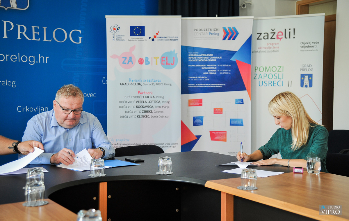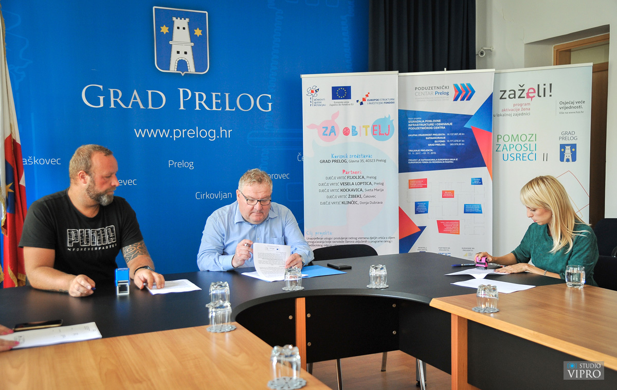 U prostorijama Grada Preloga potpisan je Ugovor o javnoj nabavi usluge „Edukacijske aktivnosti – Terapija igrom“, u okviru projekta „Za obitelj“, vrijedan 289.810,00 kuna. Ugovor je s Centrom proventus d.o.o. iz Gornjeg Stupnika, najpovoljnijim ponuditeljem u postupku javne nabave, potpisao gradonačelnik Ljubomir Kolarek. Riječ je o tri seta edukacija u ukupnom trajanju 127 sati, a koje su namijenjene odgojiteljicama iz dječjih vrtića partnera na projektu „Za obitelj“, „Fijolica“ Prelog, „Vesela loptica“ Prelog, „Klinčec“ Donja Dubrava, „Kockavica“ Sveta Marija i „Žibeki“ Čakovec. Edukacija „Terapija igrom: Vještine i intervencije za rad s djecom“ polaznicama će omogućiti bolje razumijevanje djetetovog svijeta te razvijanje vještine komunikacije potrebne u povezivanju s djetetom. Istu će polaziti 28 odgojiteljica, a ukupno će trajati 45 sati. U okviru edukacije „Terapijske igre u radu s djecom s teškoćama“ polaznice će naučiti koristiti različite pristupe terapeutske igre i kreativne tehnike u radu s djecom s teškoćama u razvoju, kako lakše razumjeti unutarnji svijet djeteta s teškoćama, te specifičnost igre i ponašanja djeteta s teškoćama u razvoju. Edukaciju će polaziti 14 odgojiteljica, a ista će trajati ukupno 22 sata. U sklopu trećeg seta edukacija „Primjena terapeutske igre u vrtićkom okruženju“ polaznice će osvijestiti važnost socio-emocionalnog razvoja te razumijevanje individualnih socio-emocionalnih potrebe djeteta. U sklopu ove edukacije polaznice će naučiti kako vještine iz terapije igrom koristiti u grupnom radu s obzirom na potrebe djeteta. Ova edukacija će ukupno trajati 60 sati, a polaziti će je 17 odgojiteljica. Uz najam dvorane i osvježenje za sve polaznike, Centar proventus d.o.o. će osigurati i potrebne materijale te potvrde o sudjelovanju. Edukacijske aktivnosti – Terapija igrom su još jedne u nizu edukacija koje se provode u okviru projekta „Za obitelj“, čiji je korisnik Grad Prelog, a čije je financiranje osigurala Europska unija iz Europskog socijalnog fonda.
