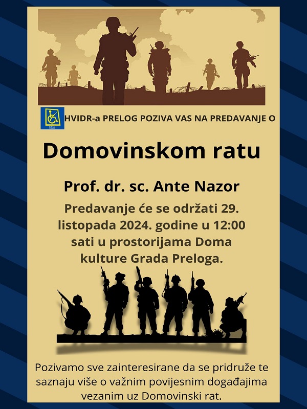 U utorak, 29. listopada, u Domu kulture Grada Preloga, predavanje o Domovinskom ratu, „Činjenice o Domovinskom ratu“, održat će povjesničar, hrvatski branitelj i ravnatelj Hrvatskog memorijalno-dokumentacijskog centra Domovinskog rata  dr. sc. Ante Nazor. Predavanje će započeti od 12 sati, a organizator je Udruga hrvatskih vojnih invalida Domovinskog rata Prelog (HVIDR-a Prelog).
