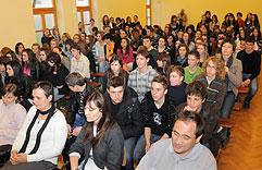 Dr. Domljan odgovarao je i na pitanja učenika koji su napunili školsku dvoranu. Na predstavljanju je bio i gradonačelnik Dragutin Glavina.