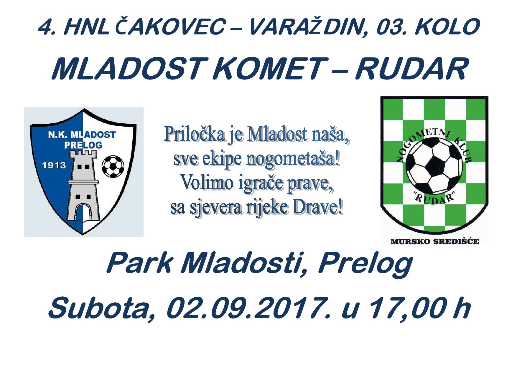U subotu 02. rujna, u sklopu 03. kola 4. Nogometne lige Čakovec – Varaždin, u Prelogu se sastaju Mladost Komet i Rudar iz Murskog Središća. nakon dva kola Rudar ima 6, a Mladost Komet 3 odvojena boda. Mladostaši se nadaju dobroj utakmici i pobjedi protiv, za njih, uvijek neugodne ekipe iz nMurskog Središća. Utakmica počinje u 17 sati, u Parku Mladosti u Prelogu.