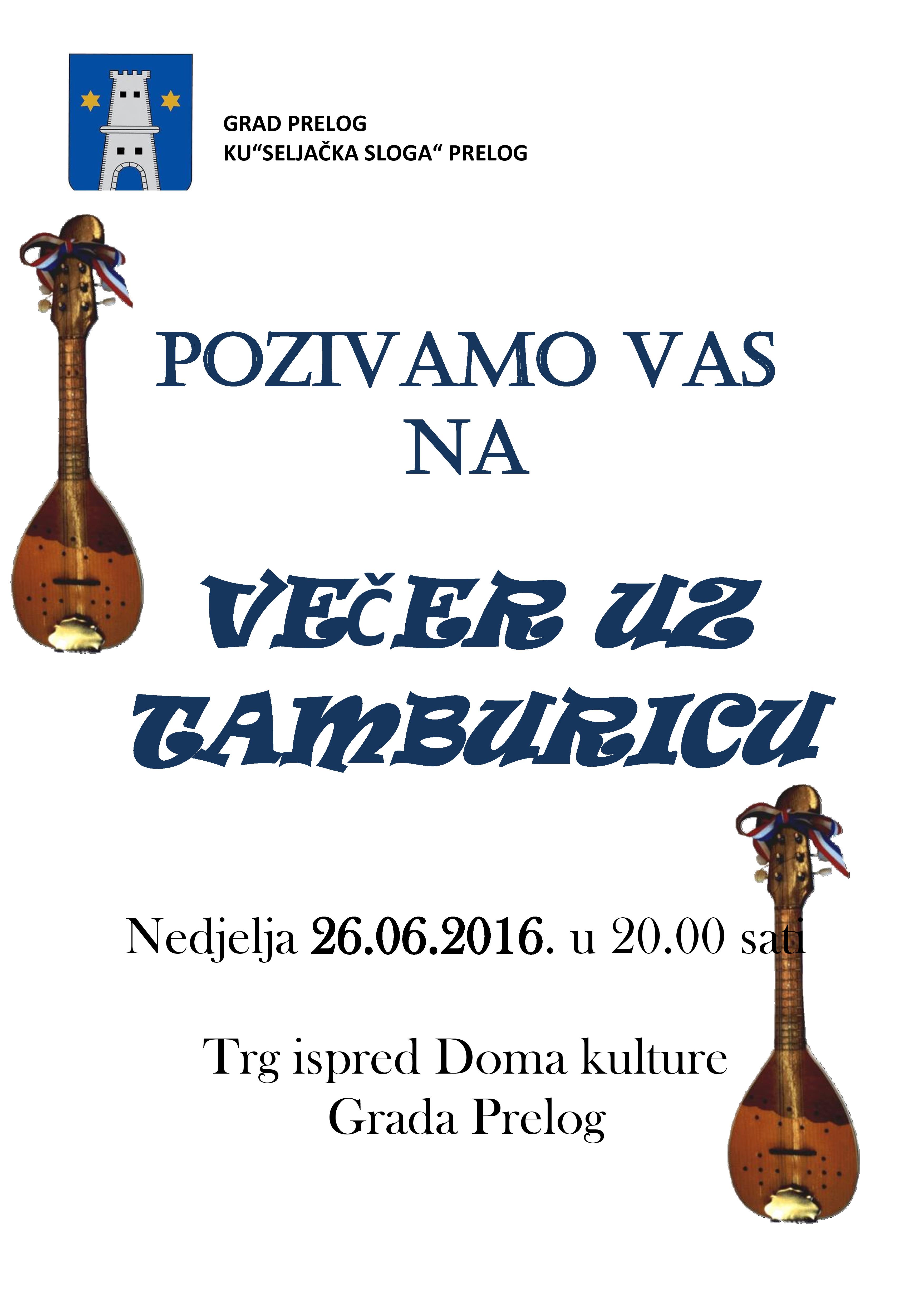 Dug i bogat razvojni put, osim folklorne glazbe prošla je i tamburica koja je oduvijek bila i ostala najpopularnije narodno glazbalo. Tamburicu i tamburašku glazbu potrebno je i dalje očuvati i njegovati te će se s tim ciljem održati dana 26. lipnja Večer uz tamburicu.Tamburaška društva iz Goričana, Bjelovara, Labora, Žiškovca, Mačkovca, TS Miris čempresa iz Preloga, TS Sinovi Međimurja i dr. nastupiti će na ljetnoj pozornici ispred Doma kulture Grada Preloga sa početkom u 20,00 sati.