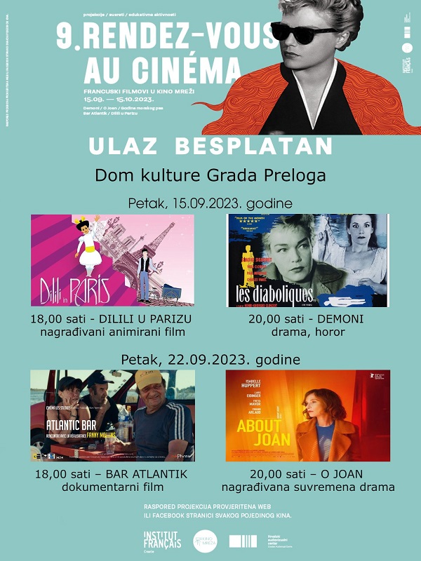 I Dom kulture Grada Preloga, uključuje se u program Rendez-vous au cinéma 2023., koji se ove godine održava od 15. rujna do 15. listopada 2023. Zajednički projekt Francuskog instituta u Hrvatskoj, Hrvatskog audiovizualnog centra i Kino mreže, “Rendez-vous au cinéma” prvi je put organiziran u 2015. godini tijekom festivala Francuske u Hrvatskoj. Ovaj značajan projekt posvećen francuskom filmu na veseo i eklektičan način okuplja različite filmske forme (igrane, dokumentarne i crtane filmove) različitih estetika s ciljem da okupi vrlo široku i raznoliku publiku na cijelom teritoriju Hrvatske. Ulaz na sve projekcije u Domu kulture Grada Preloga je besplatan.