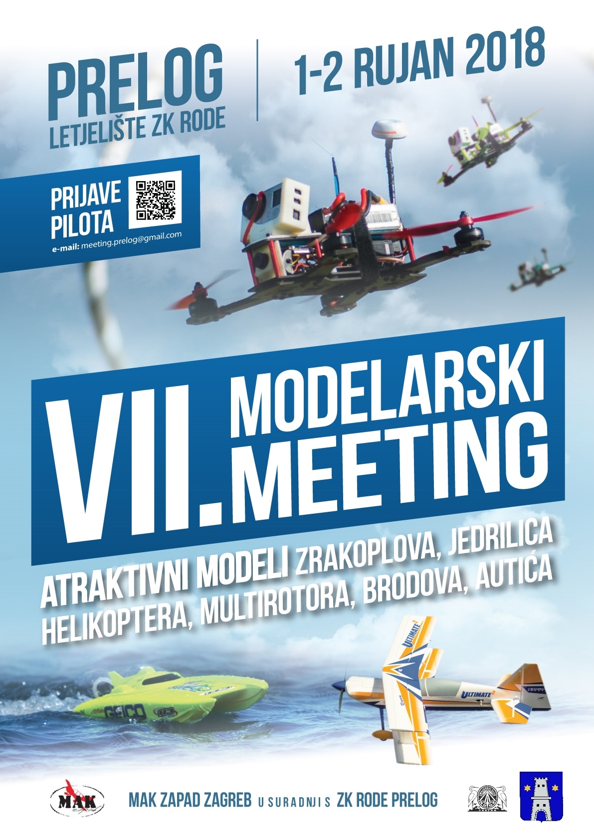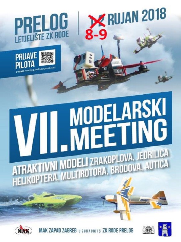 Zbog najave lošeg vremena ovoga vikenda, VII. Modelarski miting, koji se trebao održati ovoga vikenda, odgođen je za sljedeći vikend 8. i 9. rujna. Već tradicionalno, letjelište Zmajarskog kluba Rode, na prostoru Sportsko rekreacijske zone Marina Prelog, biti će domaćin atraktivnog i zanimljivog događanja. Sedmi uzastopni Modelarski miting, u organizaciji MAK Zapad i Zmajarskog kluba Rode Prelog, tako će se održati u subotu i nedjelju, 8. i 9. rujna 2018. godine u Prelogu na letjelištu Zmajarskog kluba Rode iz Preloga. Posjetitelje modelarskog mitinga očekuje bogat letački program atraktivnim modelima zrakoplova, jedrilica, helikoptera, multirotora, brodova, autića itd. Program započinje od 10,00 sati.