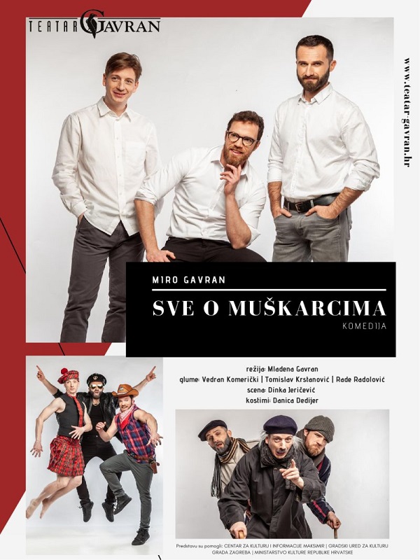 U petak, 8. studenog u 19,00 sati, na daskama Doma kulture, možete pogledati predstavu „Sve o muškarcima“, Teatra Gavran. Muški svijet u ovoj se priči razotkriva s puno humora i neočekivanih sukoba, dok svaki od glumaca igra po nekoliko različitih uloga. Radnja je smještena u današnji Zagreb, a pred nama prolaze prepoznatljivi suvremeni likovi s kojima se svaki gledatelj može lako poistovjetiti. Mladena Gavran, koja je prošle godine režirala “Sve o ženama”, prihvatila se režije i ove predstave, odabravši za nositelje zahtjevnih uloga tri mlada nadarena glumca. U ovoj dinamičnoj predstavi, glumci su odlučili pružiti vam istinsko teatarsko zadovoljstvo propitujući krajnje granice glumačkog umijeća. Brzi dijalozi, te izmjena dramskih i humornih pasaža karakteristika su ovog teksta koji pruža velike mogućnosti za glumačke transformacije. Ovaj tekst Mire Gavrana dosada je imao dvadesetak kazališnih premijera diljem svijeta, od Rio de Jeneira pa do Moskve. Ne propustite svjetsku uspješnicu, hit-komediju koja je samo u Pragu imala više od 500 repriznih izvedbi, a u Krakovu više od 400. Do sada je “Sve o muškarcima” vidjelo više od pola milijuna ljudi diljem svijeta, budite i Vi što prije među njima!