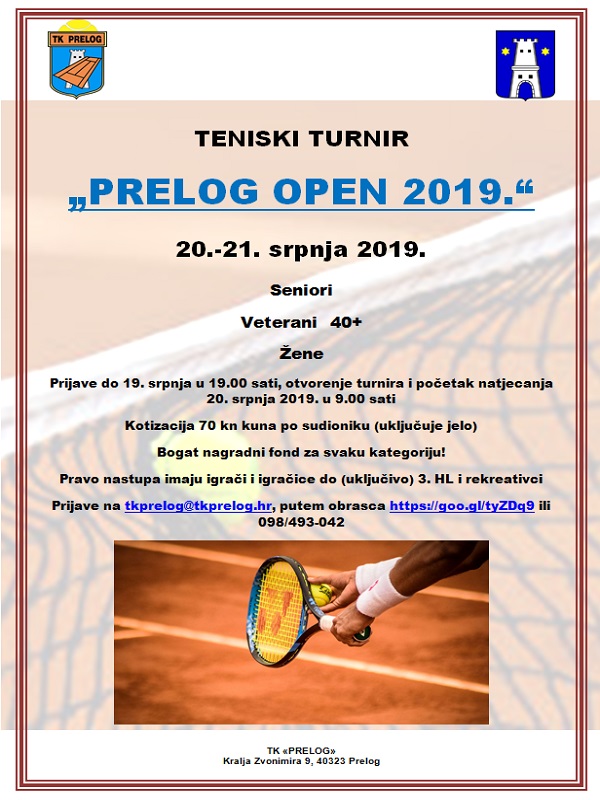 Teniski klub Prelog organizator je teniskog turnira „Prelog Open 2019.“, koji će se održati u subotu i nedjelju 20. i 21. srpnja 2019. godine na teniskim terenima Teniskog kluba Prelog. Turnir se igra na 5 zemljanih terena, a pravo nastupa imaju igrači i igračice registrirani do najviše 3. Hrvatske lige i rekreativci u seniorskoj, veteranskoj 40+ kategoriji i ženskoj kategoriji. Kotizacija iznosi 70 kuna po sudioniku u jednoj odabranoj kategoriji, a uključuje ručak. Za sve polufinaliste i finaliste u svim kategorijama osigurane su bogate nagrade. Prijave su moguće do petka, 19. srpnja 2019. u 19.00 sati putem web aplikacije Teniskog kluba Prelog te na mail adresu tkprelog@tkprelog.hr, a sve informacije možete dobiti na telefon: 098/493-042 (Zlatko Filipić). Prvi dan (subota) su na programu mečevi razigravanja u sve tri kategorije te polufinalni i finalni mečevi u ženskoj kategoriji, a drugi dan polufinalni i finalni mečevi u seniorskoj i veteranskoj kategoriji.