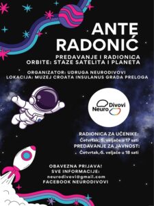 Udruga NeuroDivovi organizira, u četvrtak, 5. veljače, predavanje za javnost i radionicu za učenike Ante Radonića pod nazivom „Orbite: Staze satelita i planeta“. Sve će se održati u Muzeju Croata insulanus Grada Preloga. Radionice u sklopu događanja s početkom u 17 sati, a predavanje za javnost od 18 sati. Prijave su obavezne, a prijaviti se možete na sljedećem linku: https://docs.google.com/…/1fKIWuO53hkJpvoeTlUezsGb…/edit